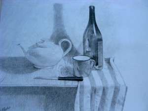 Dans une seconde phase, je propose de travailler d’après le réel des natures mortes avec peu d’objets, pour aller progressivement vers des composisitions plus complèxes et des formats plus grands.